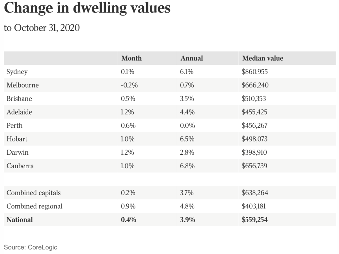 不過根據地產研究機構CoreLogic最新的數據顯示:自疫情爆發以來,澳洲房價首次出現了整體上漲,10月份澳洲全國住宅房產價格整體上漲了0.4%,中位價達到559254澳元。除了遭受第二波疫情的墨爾本房價仍有小幅下降之外,其他首付城市房價均在上漲。業內專業人士稱,各種數據表明澳洲房市或以觸底。