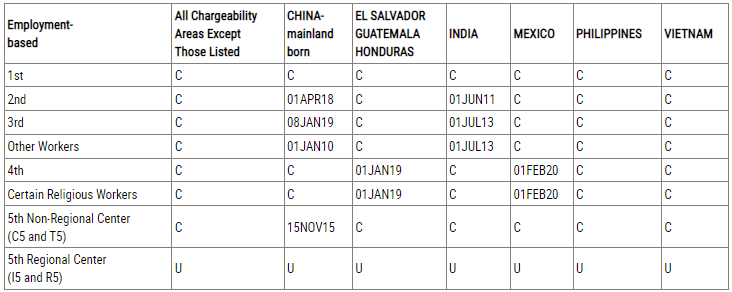 根據職業移民排期表B,EB-1、EB-4類別繼續無排期,EB-2、EB-3、EB-5類別沒有前進,原地踏步。