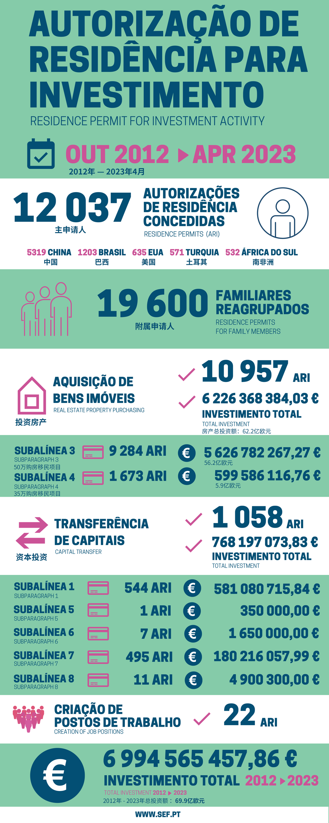 近日,葡萄牙移民局(SEF)正式發(fā)布了4月的黃金簽證最新統(tǒng)計(jì)數(shù)據(jù)。4月共有116位主申請(qǐng)人和167位附屬申請(qǐng)人獲批葡萄牙黃金簽證。獲批總?cè)藬?shù)為283人,總投資額約6327萬(wàn)歐元。