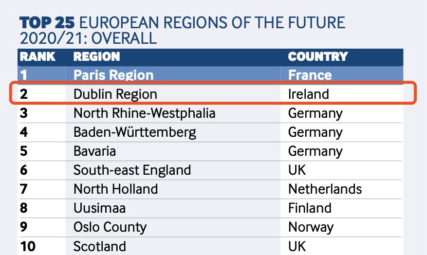 據最新發布的《2020/21歐洲未來城市和地區》排名顯示,都柏林地區在“歐洲最佳投資地區”排名中榮獲第二名,被列為外國直接投資首選地區之一。