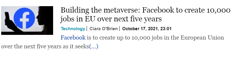 Facebook將在愛(ài)爾蘭和歐洲開(kāi)啟萬(wàn)人招募計(jì)劃,構(gòu)建元宇宙!