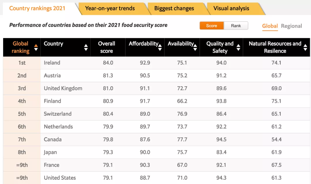 近日,全球知名雜志《經(jīng)濟(jì)學(xué)人》(The Economist Group)發(fā)布了《2021全球食品安全指數(shù)》排名,愛爾蘭以84.0的綜合分?jǐn)?shù)再次摘下全球第一的桂冠!中國(guó)以71.3的綜合分?jǐn)?shù)排名全球第34位。