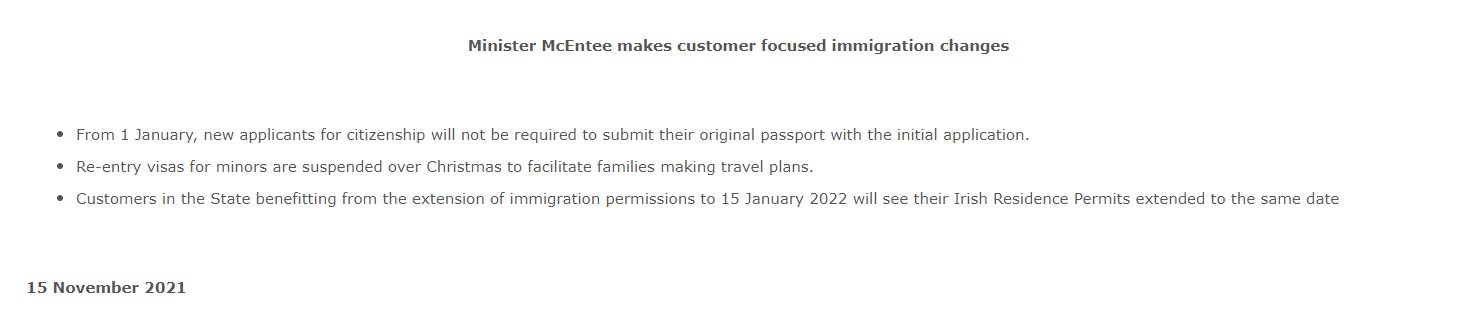 11月15日,愛爾蘭司法部長(zhǎng)海倫·麥肯蒂(Helen McEntee)宣布了一系列利好的移民舉措:包括簡(jiǎn)化入籍申請(qǐng)程序;以及臨時(shí)放寬持過期但符合延期要求的IRP卡人士的出入境限制,以方便他們能在圣誕假期及2022年1月15日之前往返愛爾蘭;同時(shí)臨時(shí)取消了16歲以下兒童需提供再入境簽證的要求。