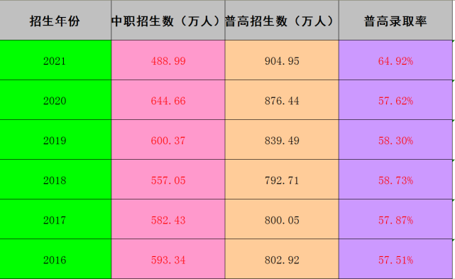 從上圖看,2016年至2021年,全國(guó)普通高中招生人數(shù)從802萬提高到904萬,增幅達(dá)12.5%。雖然普通高中的錄取率逐年提升,但是每年仍有數(shù)百萬學(xué)生被分流到職業(yè)學(xué)校學(xué)習(xí)。