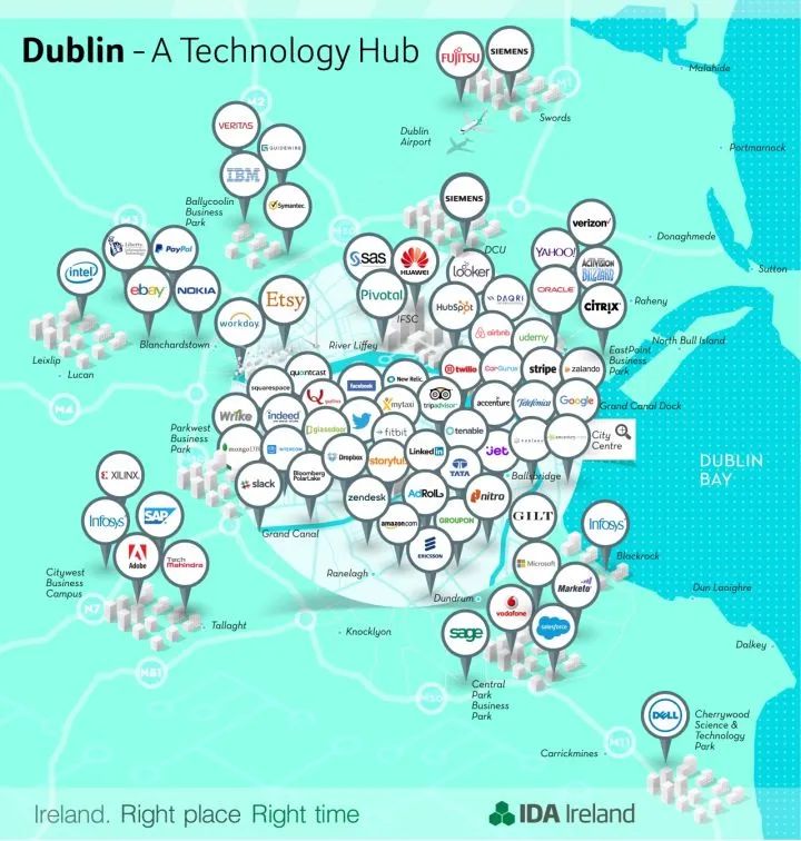 眾多歐美及中國互聯(lián)網(wǎng)科技公司都在愛爾蘭有非常大的運營規(guī)模,并以愛爾蘭作為中心輻射全球市場。比如蘋果、谷歌、Meta、微軟、亞馬遜、LinkedIn、Twitter、IBM、英特爾、華為和抖音等大型科技公司。