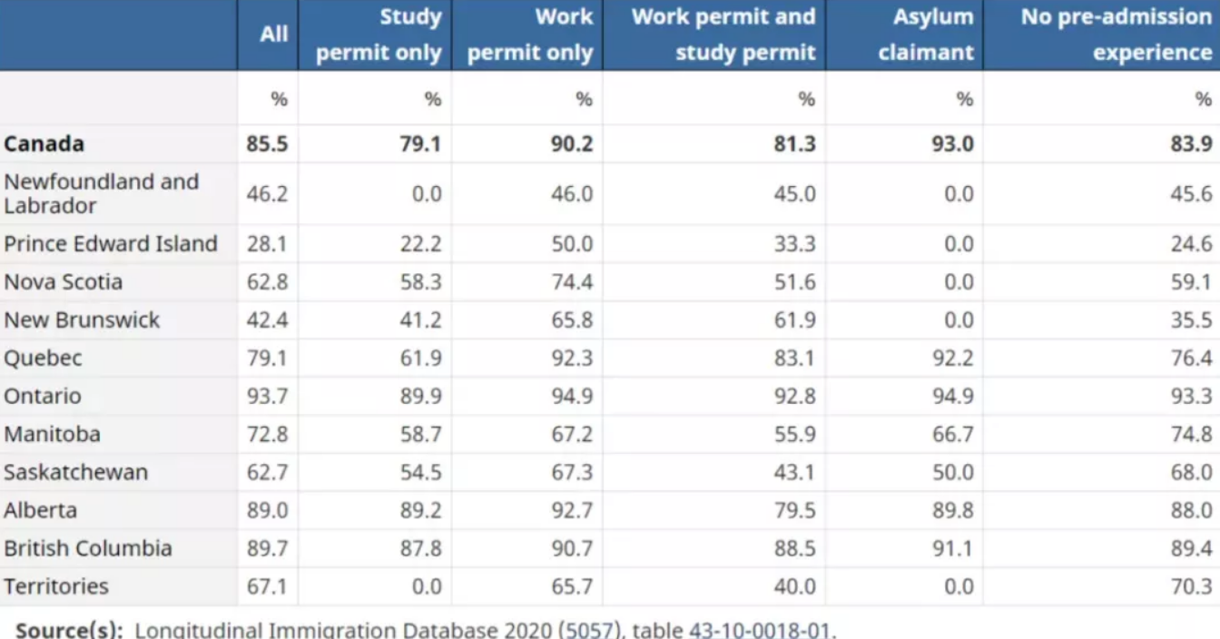 在加拿大工作或學習的經(jīng)歷會影響移民在不同地區(qū)之間移動的決定。尤其就業(yè)是留住人才的關鍵,有工作許可的移民保留率達到90.2%。