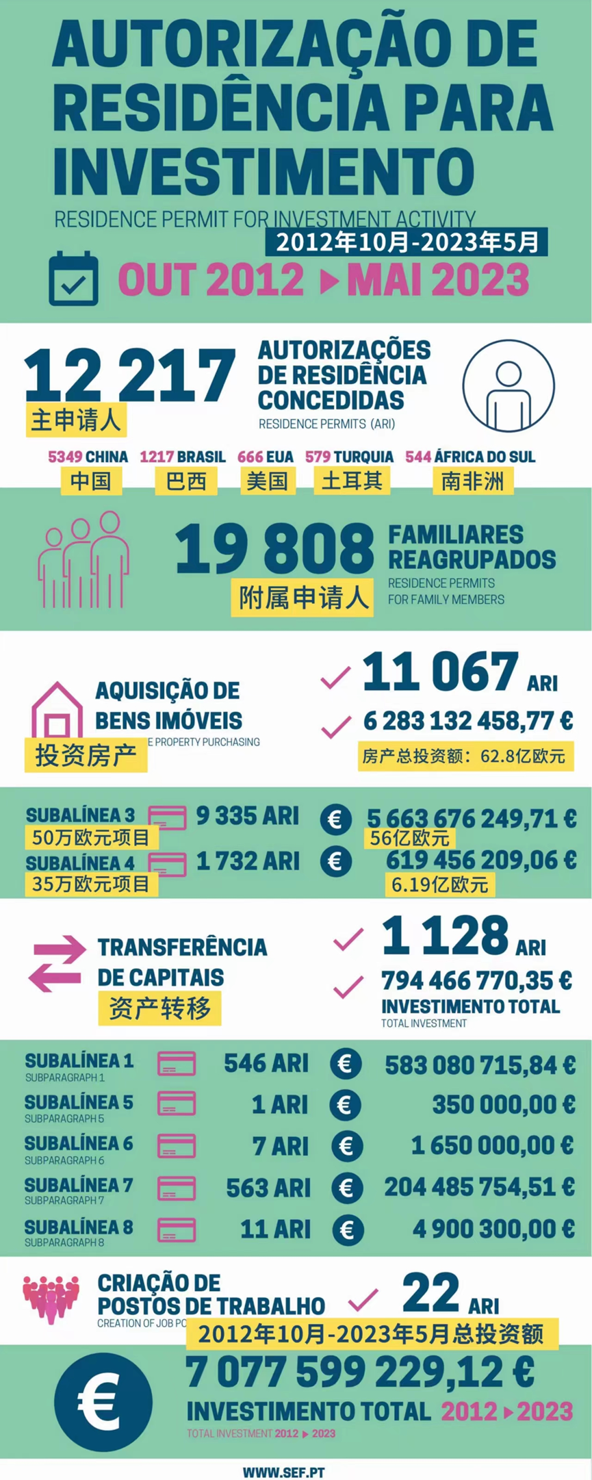 葡萄牙移民局(SEF)正式發(fā)布了5月的黃金簽證統(tǒng)計(jì)數(shù)據(jù)。5月共有180位主申請(qǐng)人和208位附屬申請(qǐng)人獲批葡萄牙黃金簽證。獲批總?cè)藬?shù)為388人,總投資額約8303萬歐元。