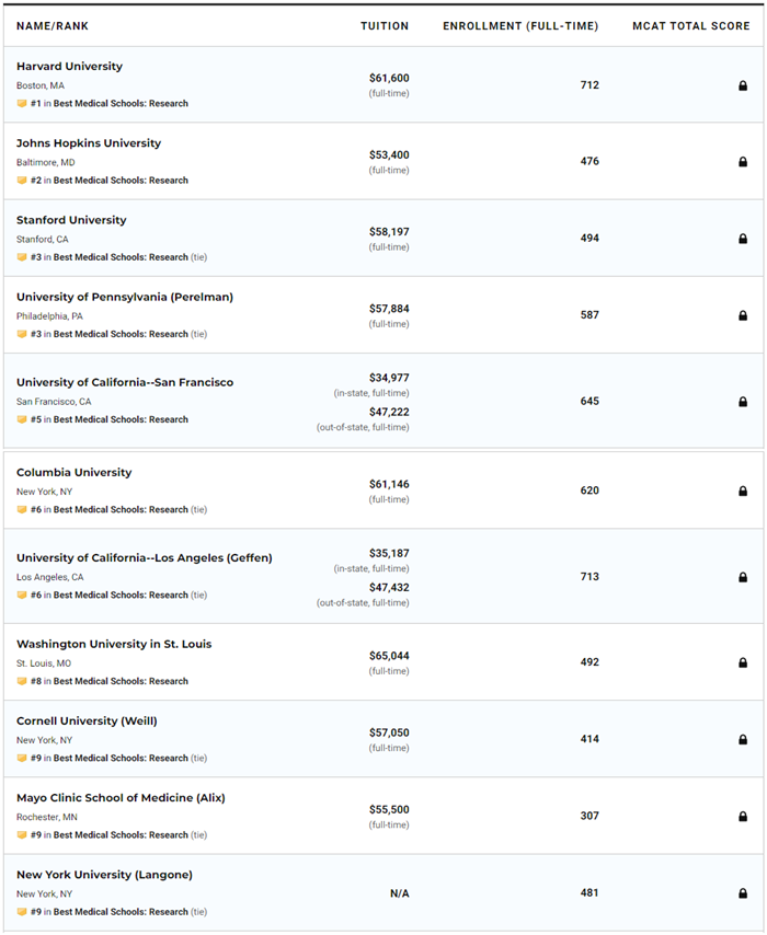 不過,不管是醫(yī)學(xué),還是護(hù)理,國際生都不多。不是每所醫(yī)學(xué)院都招國際生(有綠卡的孩子就沒有這層顧忌),部分醫(yī)學(xué)院可能只有一兩個方向?qū)α魧W(xué)生開放。下面是Research方向的TOP10排名: