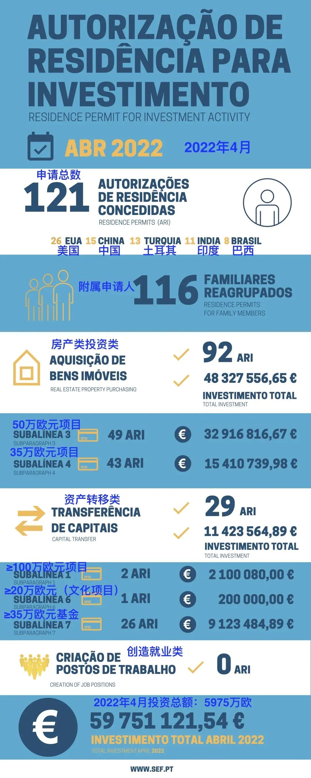 葡萄牙移民局(SEF)日前公布了2022年4月的黃金簽證數據。4月,共有121位主申請人及其116位家庭附屬申請人獲批黃金簽證。