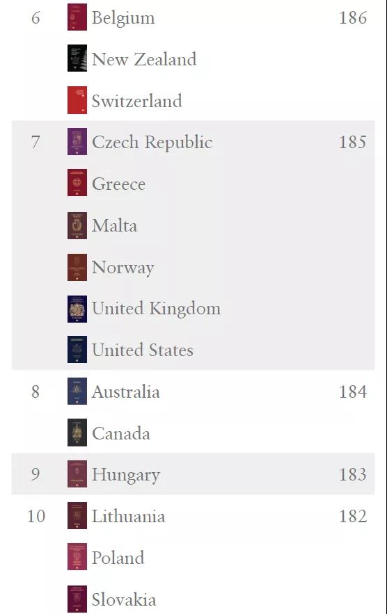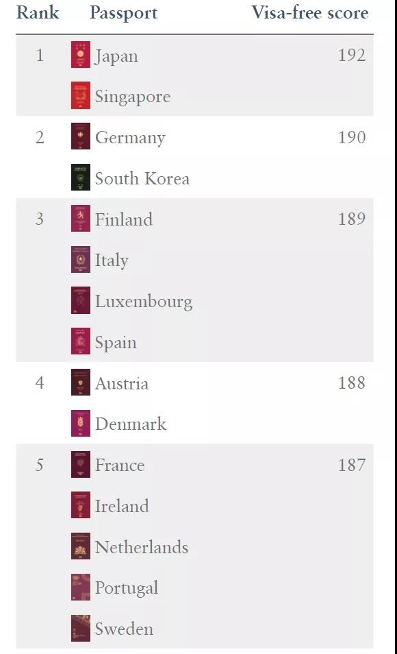 近日,全球最具權(quán)威的護照含金量排行榜“亨氏護照指數(shù)”發(fā)布了2021Q4(第四季度)的全球排名。日本、新加坡護照以持有人可以免簽進入世界192個國家和地區(qū)并列第一,德國和韓國以190個免簽數(shù)量并列第二。排行榜前10名除了日、韓以及新加坡以外,大多數(shù)皆為歐洲國家,愛爾蘭、法國、葡萄牙、荷蘭及瑞典并列榜單第五位,力壓英美等一線大國。