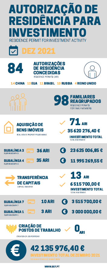 近日,葡萄牙移民局(SEF)公布了2021年12月的黃金簽證數據。2021年12月,共有84位主申請人和98位附屬申請人獲批葡萄牙黃金簽證。其中,來自中國的主申請人為14位,排名第一。其次是美國(13位)、巴西(11位)、俄羅斯(10位)、英國(4位)。
