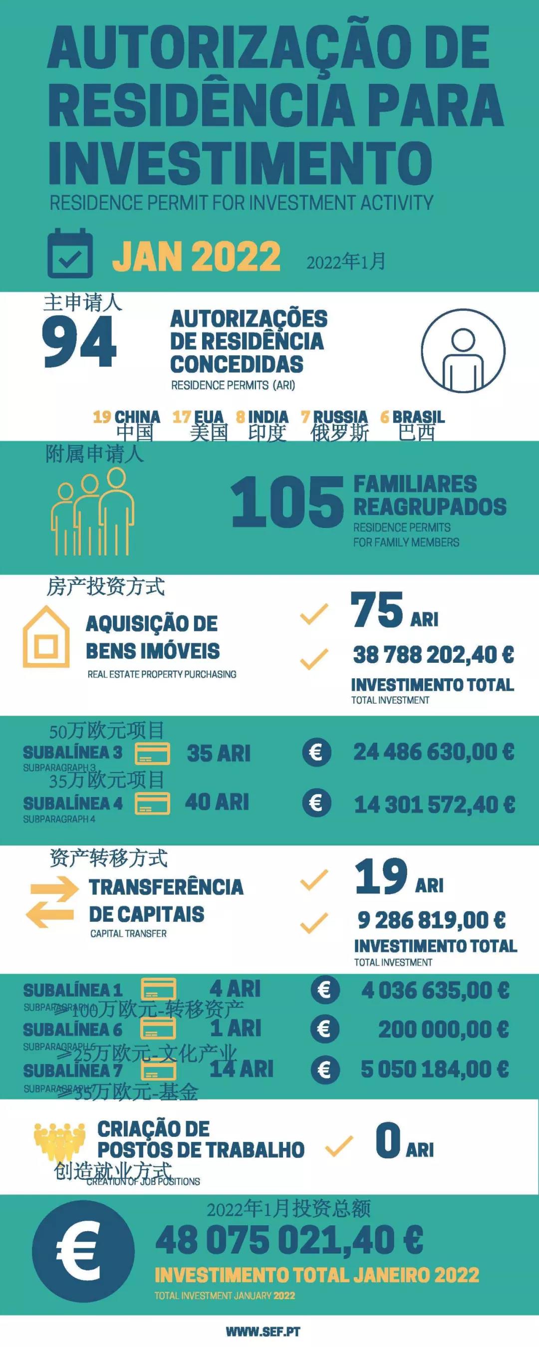 門檻提高、政策收緊后,葡萄牙黃金簽證表現如何呢?日前,葡萄牙移民局(SEF)公布了2022年1月的黃金簽證數據,我們一起來看看吧。