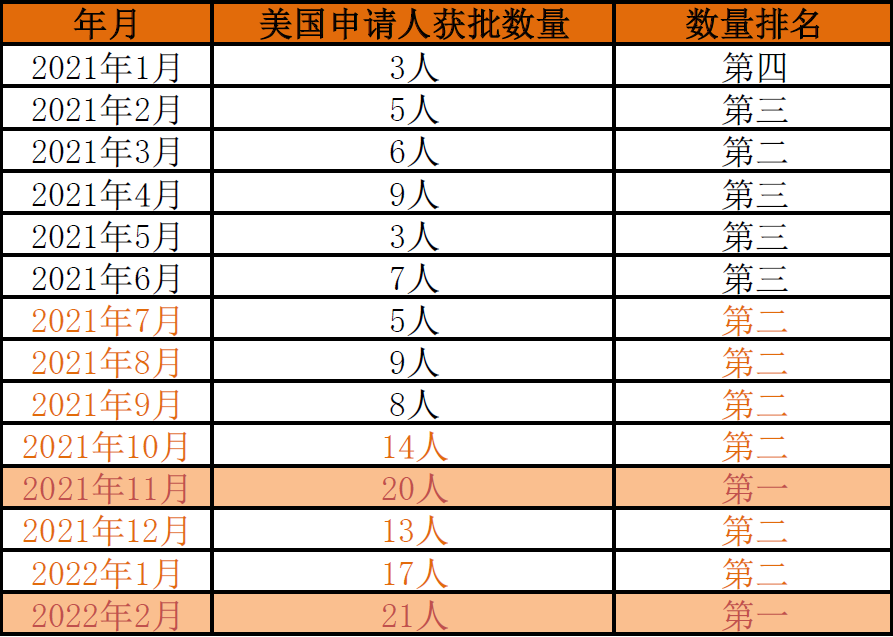·2021年11月,美國獲批申請人數量首次超過中國,排名當月第一;