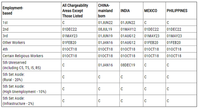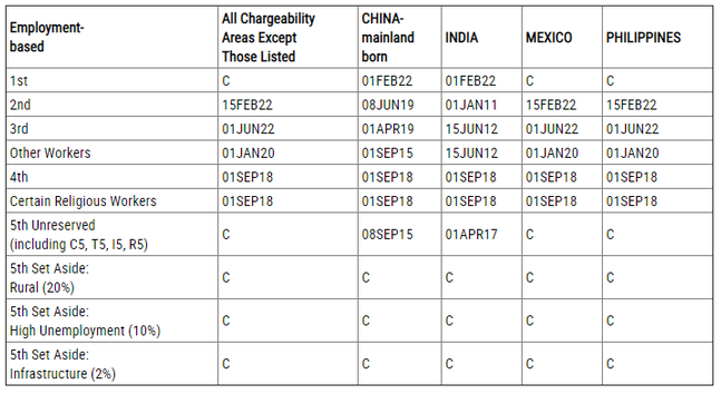 EB-3:技術(shù)類專業(yè)勞工排期為2019年4月1日,無變化;非技術(shù)勞工排期為2015年9月1日,前進139天